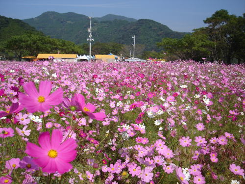 Cosmos Festival is being held for about half a month. Some people may worry that they can’t enjoy enough by only watching cosmoses. But there’s no need to worry about it! The host of this festival tries various measures to amuse visitors. Hana-basya is one of the popular events of the festival. It’s a horse-drawn carriage that takes visitors around the park. The horse comes from Miyazaki prefecture, and it’s called Hanako. The park is a little bit large, so this event is good for elderly people or a family with small children. Some other special events are held every weekend during the festival. For example, visitors can enjoy the concert conducted by students who belongs to a brass band club in Ochi junior high school, and they can also join the karaoke competition. Of course, it goes without saying that there are many street stalls during the festival.