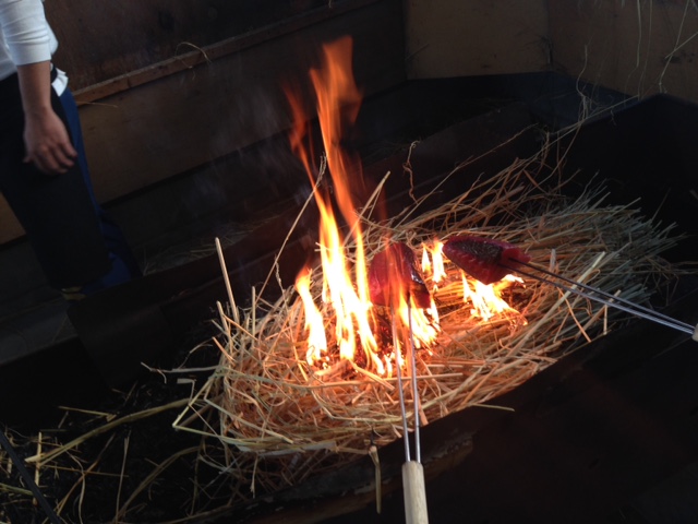IMG_1151It is a nice warm afternoon, perfect for visiting the restaurant ‘Katsuo Fune’ near Katsurahama Beach on an empty stomach. In the huge ship-shaped building, visitors have a chance to experience grilling katsuo no tataki. The staff greets you at the front door and asks which course you would like to eat: Katsuo no tataki teishoku (with rice and miso soup) or Katsuo no tataki tanpin (a la carte). After ordering visitors are handed a long pole with a huge slab of katsuo (“bonito”) skewered on the end. Then Nishimoto-san, the head cook, guides you to the grilling station and prepares the rice straw fire for grilling.