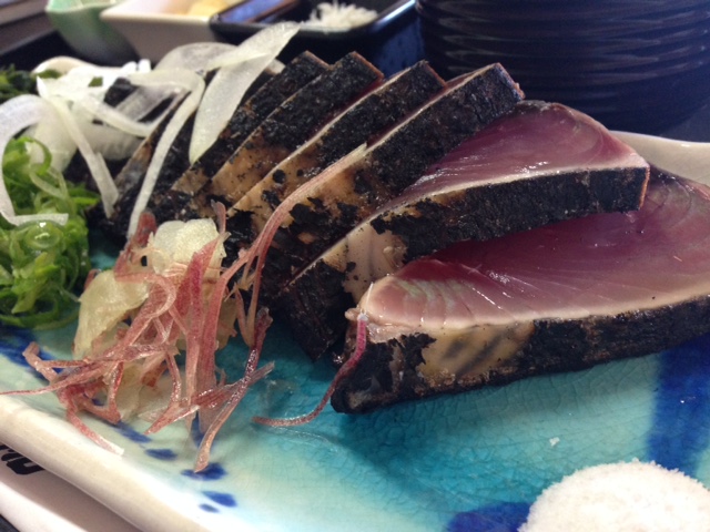 FullSizeRenderKochi’s signature dish is Katsuo no Tataki— grilled bonito.  The skin is lightly roasted, leaving the interior raw, then sliced thickly and served with garlic, shiso, spring onions, ponzu, and salt. It’s a popular dish among locals and visitors alike.