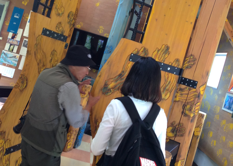 “Isn’t it a café? I don’t see any museums.” That would be your first impression getting there. “See if there is someone here.” Waiting for any people for a while after knocking on the door of the “café,” a man with a great white beard came out. That elderly man whose age seemed about 70 gently greets us with a smile. His name is Mituhito Takeuchi. As your first step going into the museum, tons of handprints on the wall (and tables or doors as well) will surround you in a flash. Every print or scratch was roughly framed with varieties of colors. These were casually giving us some sort of fear.