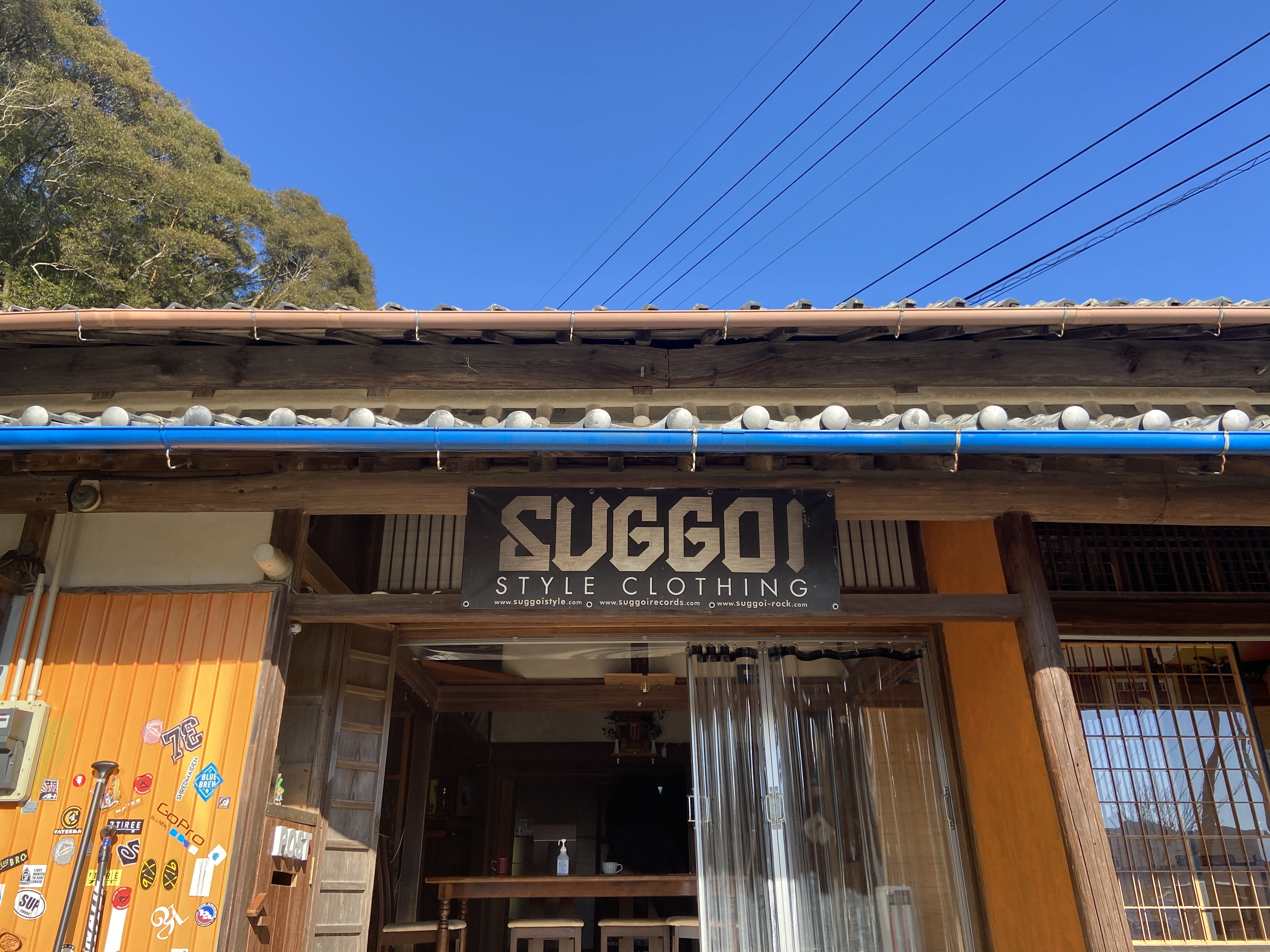 Sandwiched between the mountains and the river, a classic Japanese house stands next to a road. A slightly smaller baby buggy car is parked beside a signboard with the colorful words “SUP CAFE STAY, SUGGOI SPORTS”. The contrast between the pure blue of the sky and the deep green of the mountains is clear to the eyes and time passes by so peacefully that enables one to hear the calming flow of the nearby Niyodo river.